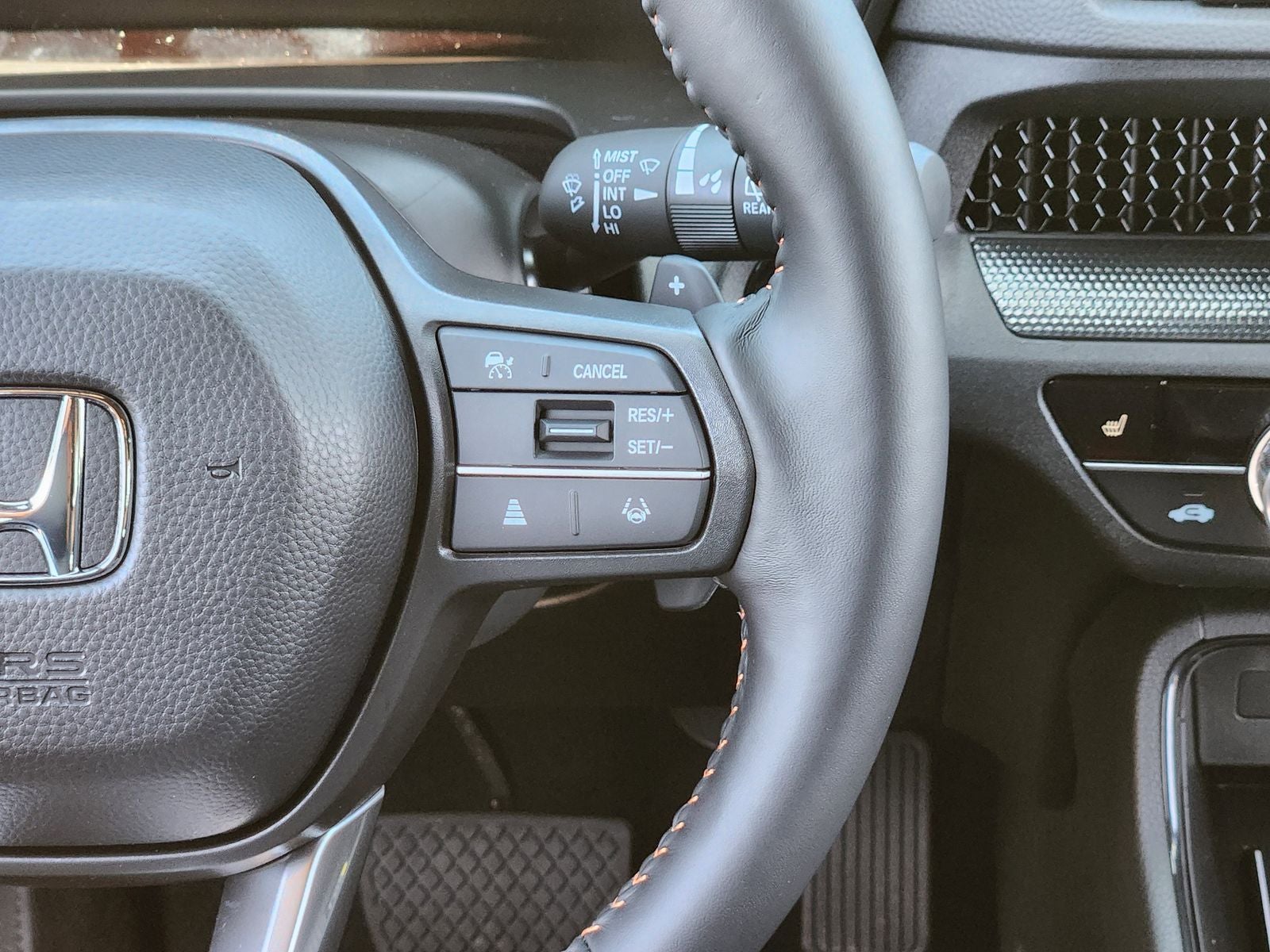 This 2025 Honda CR-V Hybrid Sport-L in Canyon River Blue Metallic comes with the following features: 2.0L I4 DOHC 16V eCVT AWD 4-Wheel Disc Brakes, 8 Speakers, ABS brakes, Adaptive Cruise Control: Adaptive Cruise Control (ACC) with Low-Speed Follow, Air Conditioning, Alloy wheels, AM/FM radio: SiriusXM, Auto High-beam Headlights, Auto-dimming Rear-View mirror, Automatic temperature control, Blind Spot Information (BSI) System warning, Brake assist, Bumpers: body-color, Compass, Delay-off headlights, Driver door bin, Driver vanity mirror, Dual front impact airbags, Dual front side impact airbags, Electronic Stability Control, Exterior Parking Camera Rear, Four wheel independent suspension, Front anti-roll bar, Front Bucket Seats, Front Center Armrest, Front dual zone A/C, Front reading lights, Fully automatic headlights, Heated door mirrors, Heated Front Bucket Seats, Heated front seats, Illuminated entry, Knee airbag, Leather Seat Trim, Leather Shift Knob, Leather steering wheel, Low tire pressure warning, Memory seat, Occupant sensing airbag, Outside temperature display, Overhead airbag, Overhead console, Panic alarm, Passenger door bin, Passenger vanity mirror, Power door mirrors, Power driver seat, Power Liftgate, Power moonroof, Power passenger seat, Power steering, Power windows, Radio data system, Radio: 320-Watt AM/FM/HD/SiriusXM Audio System, Rear anti-roll bar, Rear reading lights, Rear seat center armrest, Rear side impact airbag, Rear window defroster, Rear window wiper, Remote keyless entry, Security system, Speed control, Speed-sensing steering, Speed-Sensitive Wipers, Split folding rear seat, Spoiler, Steering wheel mounted audio controls, Telescoping steering wheel, Tilt steering wheel, Traction control, Trip computer, Turn signal indicator mirrors, Variably intermittent wipers, and Wheels: 18 Berlina Black Alloy. 40/34 City/Highway MPG