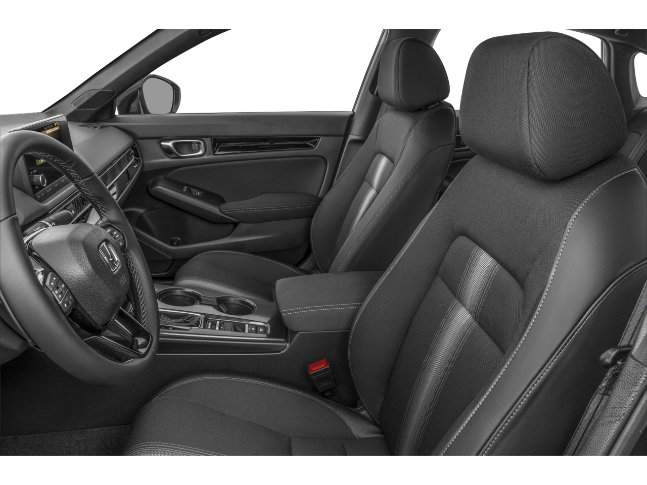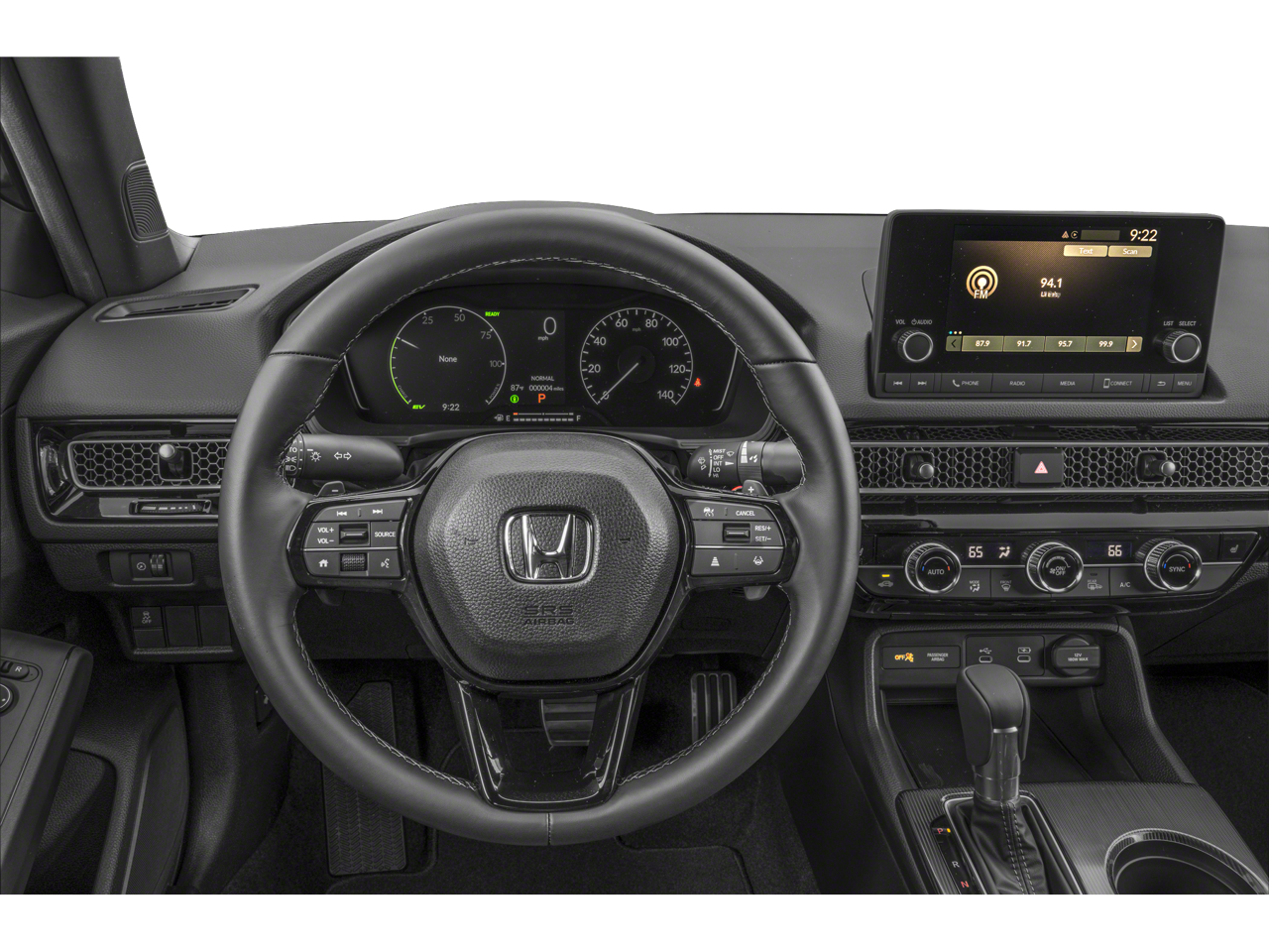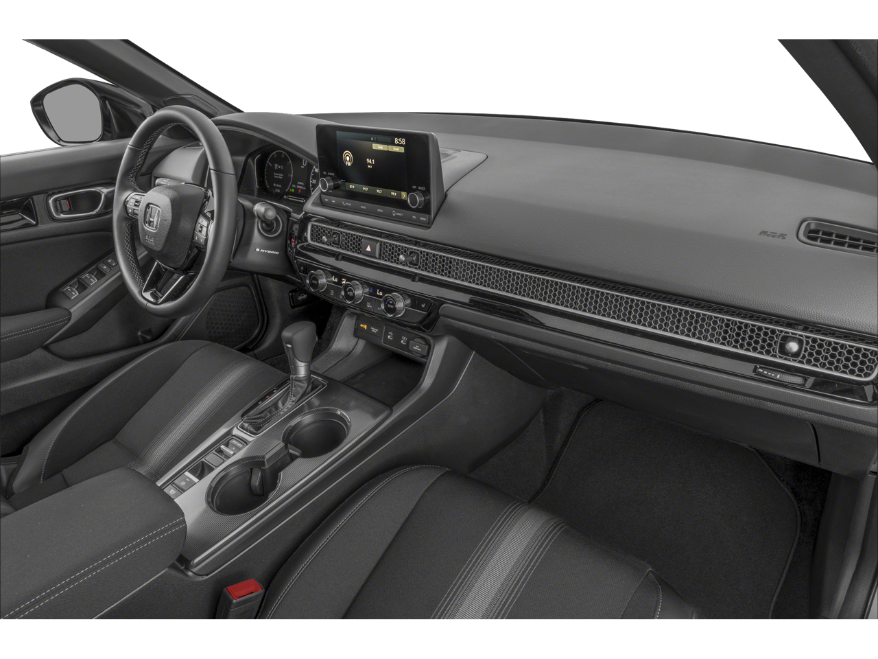 This 2026 Honda Civic Hybrid Sport in Blue Lagoon Pearl comes with the following features: 2.0L 16V DOHC eCVT FWD 2.0L 16V DOHC, 4-Wheel Disc Brakes, 8 Speakers, ABS brakes, Adaptive Cruise Control: Adaptive Cruise Control (ACC) with Low-Speed Follow, Air Conditioning, Alloy wheels, AM/FM radio, Apple CarPlay/Android Auto, Auto High-beam Headlights, Automatic temperature control, Blind Spot Information (BSI) System warning, Brake assist, Bumpers: body-color, Cloth/Leatherette Seat Trim, Delay-off headlights, Driver door bin, Driver vanity mirror, Dual front impact airbags, Dual front side impact airbags, Electronic Stability Control, Emergency communication system: HondaLink, Exterior Parking Camera Rear, Four wheel independent suspension, Front anti-roll bar, Front Bucket Seats, Front Center Armrest, Front dual zone A/C, Front reading lights, Fully automatic headlights, Heated door mirrors, Heated Front Bucket Seats, Heated front seats, Illuminated entry, Knee airbag, Leather Shift Knob, Leather steering wheel, Low tire pressure warning, Occupant sensing airbag, Outside temperature display, Overhead airbag, Panic alarm, Passenger door bin, Passenger vanity mirror, Power door mirrors, Power moonroof, Power steering, Power windows, Radio data system, Radio: 180-Watt Audio System, Rear anti-roll bar, Rear seat center armrest, Rear side impact airbag, Rear window defroster, Remote keyless entry, Security system, Speed control, Speed-sensing steering, Split folding rear seat, Steering wheel mounted audio controls, Tachometer, Telescoping steering wheel, Tilt steering wheel, Traction control, Trip computer, Variably intermittent wipers, and Wheels: 18 Gloss Black Alloy. 50/47 City/Highway MPG