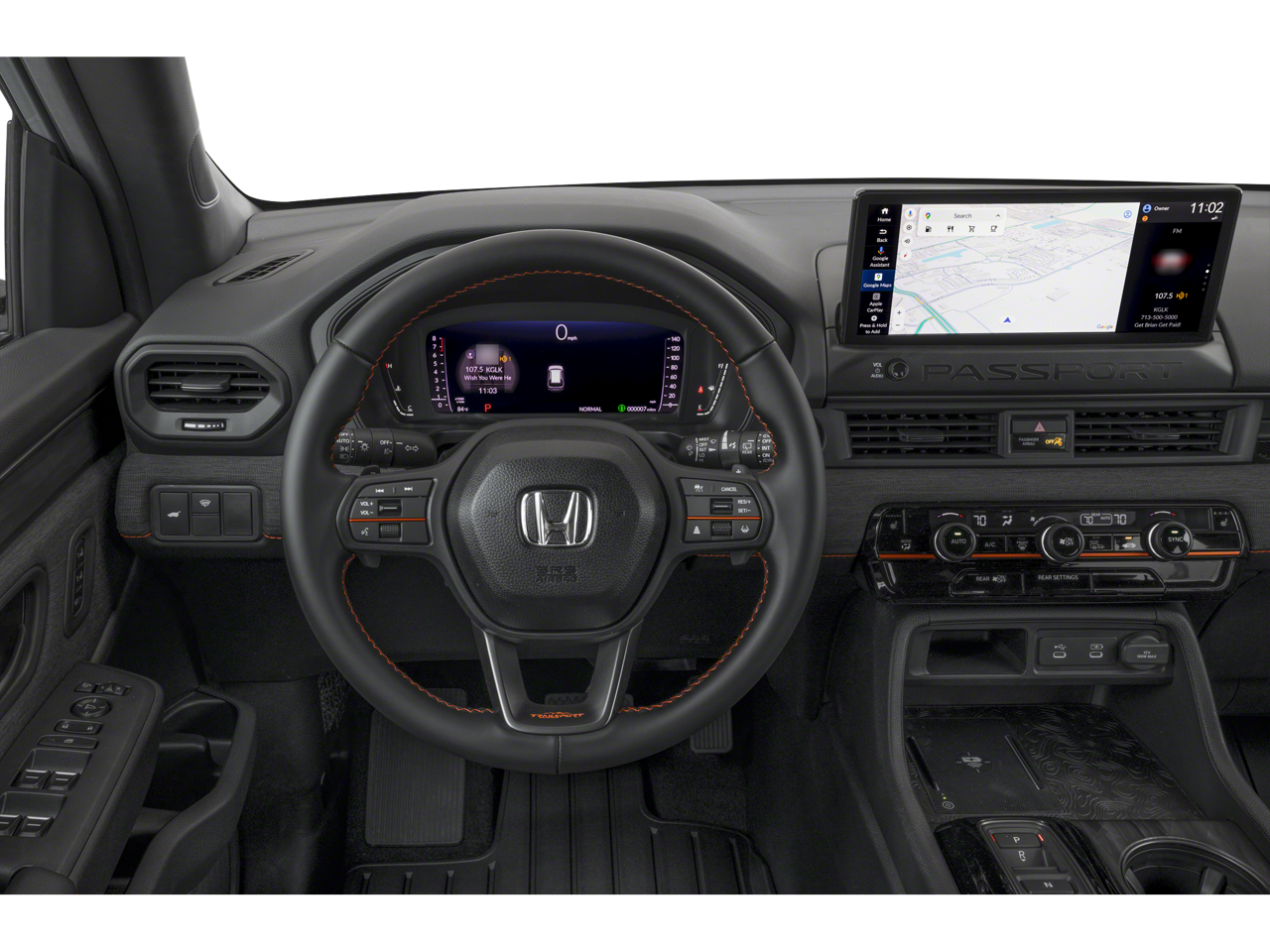 This 2026 Honda Passport TrailSport Blackout in Crystal Black Pearl comes with the following features: 3.5L V6 DOHC 24V 10-Speed Automatic AWD 4-Wheel Disc Brakes, 9 Speakers, ABS brakes, Adaptive Cruise Control: Adaptive Cruise Control (ACC) with Low-Speed Follow, Air Conditioning, Alloy wheels, Apple CarPlay/Android Auto, Auto High-beam Headlights, Auto-dimming Rear-View mirror, Automatic temperature control, Blind Spot Information (BSI) System warning, Brake assist, Compass, Delay-off headlights, Driver door bin, Driver vanity mirror, Driver's Seat Mounted Armrest, Dual front impact airbags, Dual front side impact airbags, Durable Leatherette and Cloth Seat Trim, Electronic Stability Control, Emergency communication system: HondaLink, Exterior Parking Camera Rear, Four wheel independent suspension, Front anti-roll bar, Front Bucket Seats, Front Center Armrest, Front dual zone A/C, Front fog lights, Front reading lights, Fully automatic headlights, Heated door mirrors, Heated Front Bucket Seats, Heated front seats, HVAC memory, Illuminated entry, Knee airbag, Lane departure: Lane Keeping Assist System (LKAS) active, Leather steering wheel, Low tire pressure warning, Memory seat, Navigation system: Google Maps, Occupant sensing airbag, Outside temperature display, Overhead airbag, Overhead console, Panic alarm, Passenger door bin, Passenger seat mounted armrest, Passenger vanity mirror, Power door mirrors, Power driver seat, Power Liftgate, Power moonroof, Power passenger seat, Power steering, Power windows, Radio data system, Radio: Audio System with 9 Speakers, Rear air conditioning, Rear anti-roll bar, Rear reading lights, Rear seat center armrest, Rear window defroster, Rear window wiper, Remote keyless entry, Security system, Speed control, Speed-sensing steering, Split folding rear seat, Spoiler, Steering wheel mounted audio controls, Tachometer, Telescoping steering wheel, Tilt steering wheel, Traction control, Trip computer, Turn signal indicator mirrors, Variably intermittent wipers, and Wheels: 18 HPD Black Alloy.