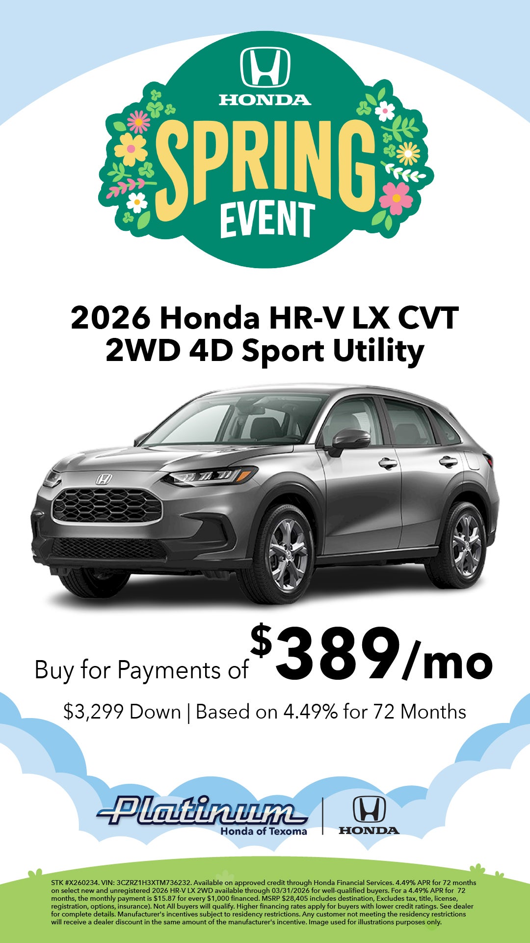 STK #X260234. VIN: 3CZRZ1H3XTM736232. Available on approved credit through Honda Financial Services. 4.49% APR for 72 months on select new and unregistered 2026 HR-V LX 2WD available through 03/31/2026 for well-qualified buyers. For a 4.49% APR for 72 months, the monthly payment is $15.87 for every $1,000 financed. MSRP $28,405 includes destination, Excludes tax, title, license, registration, options, insurance). Not All buyers will qualify. Higher financing rates apply for buyers with lower credit ratings. See dealer for complete details. Manufacturer's incentives subject to residency restrictions. Any customer not meeting the residency restrictions will receive a dealer discount in the same amount of the manufacturer's incentive. Image used for illustrations purposes only.