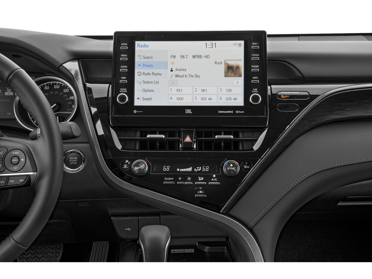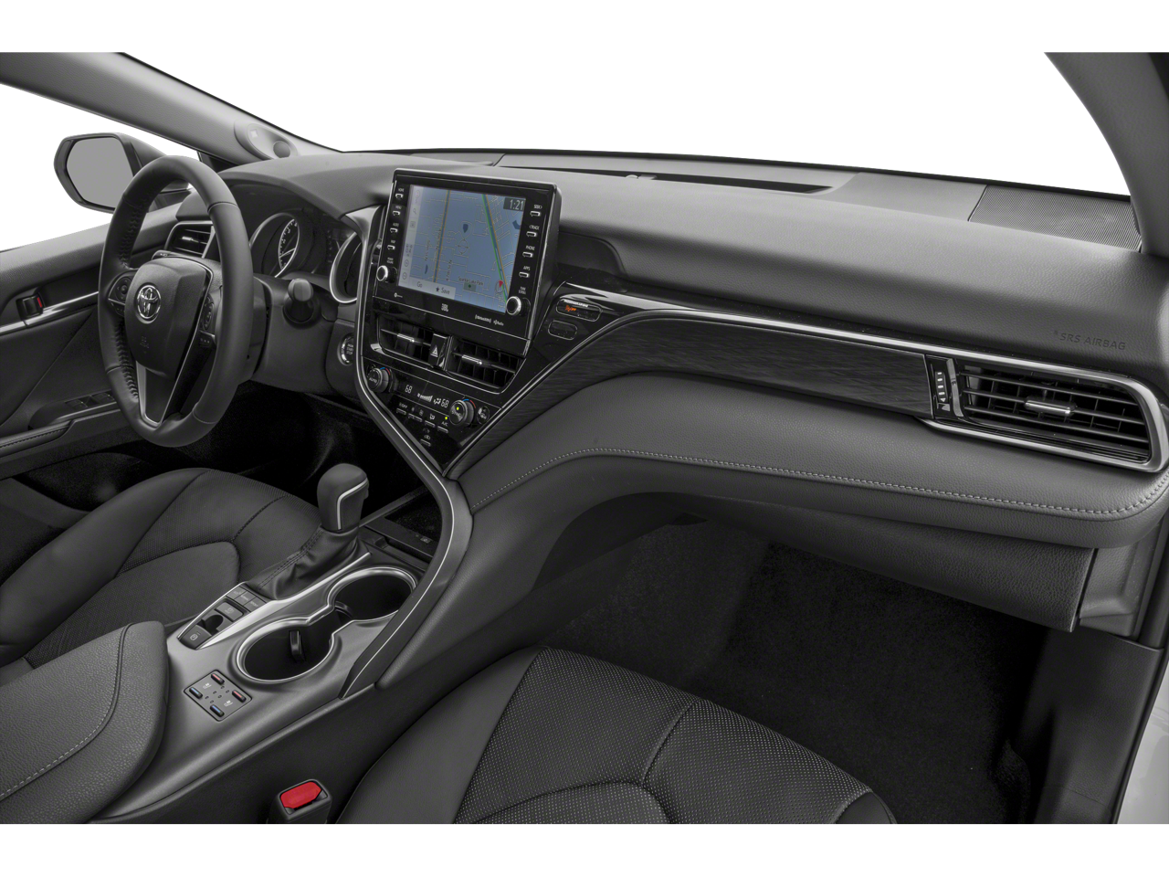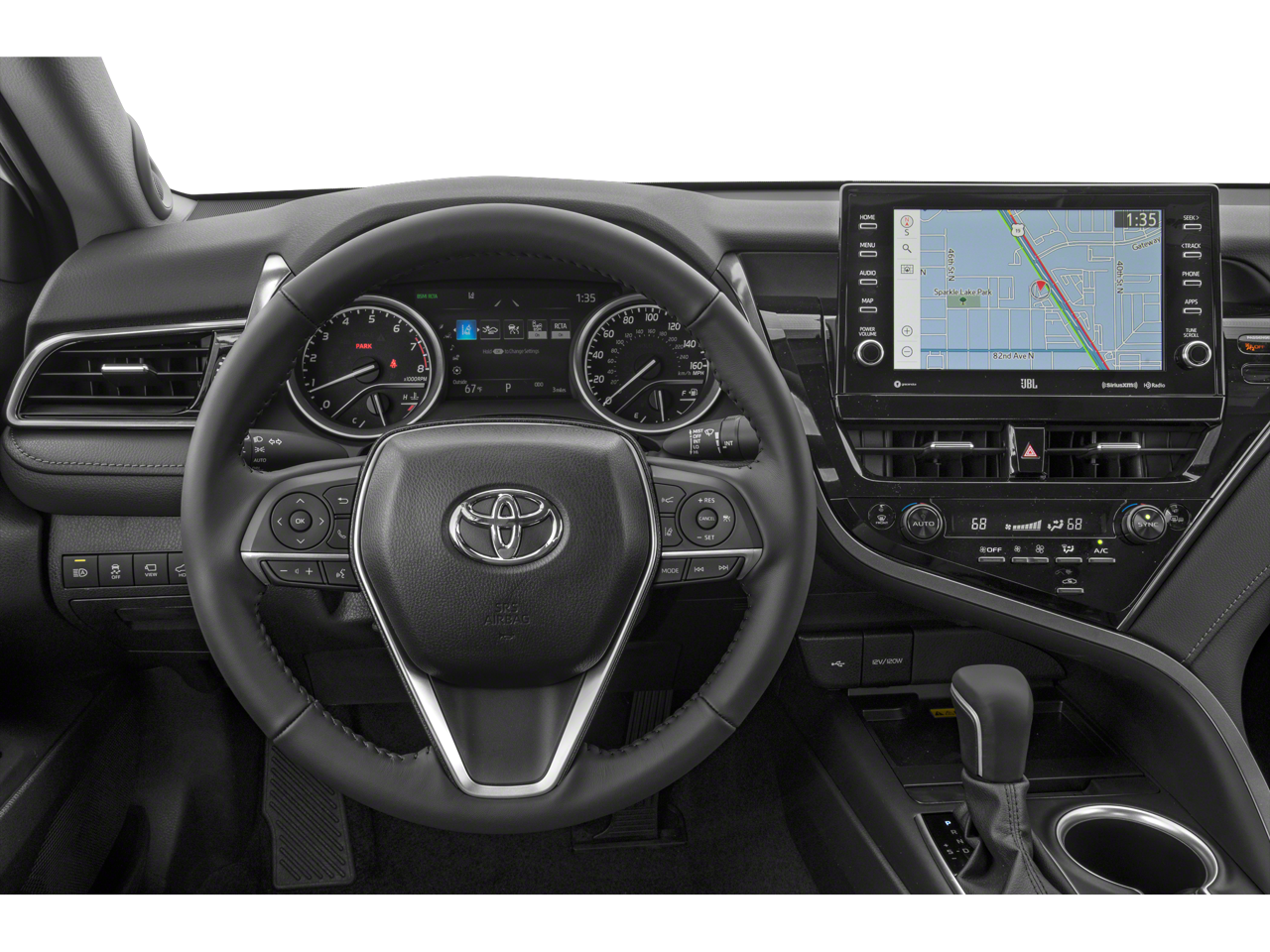 This 2024 Toyota Camry comes nicely equipped with Leather, 18 x 8J Alloy Wheels, 4-Wheel Disc Brakes, 6 Speakers, ABS brakes, Air Conditioning, Alloy wheels, AM/FM radio: SiriusXM, Apple CarPlay/Android Auto, Auto High-beam Headlights, Auto-dimming Rear-View mirror, Automatic temperature control, Brake assist, Bumpers: body-color, Delay-off headlights, Driver door bin, Driver vanity mirror, Dual front impact airbags, Dual front side impact airbags, Electronic Stability Control, Emergency communication system: Safety Connect (1-year trial), Exterior Parking Camera Rear, Four wheel independent suspension, Front anti-roll bar, Front Bucket Seats, Front Center Armrest, Front dual zone A/C, Front reading lights, Fully automatic headlights, Garage door transmitter: HomeLink, Heated door mirrors, Heated front seats, Illuminated entry, Knee airbag, Leather steering wheel, Low tire pressure warning, Multi-Stage Heated Front Bucket Seats, Occupant sensing airbag, Outside temperature display, Overhead airbag, Overhead console, Panic alarm, Passenger door bin, Passenger vanity mirror, Perforated Leather Seat Trim, Power door mirrors, Power driver seat, Power passenger seat, Power steering, Power windows, Radio data system, Radio: Audio Plus, Rear anti-roll bar, Rear reading lights, Rear seat center armrest, Rear side impact airbag, Rear window defroster, Remote keyless entry, Security system, Speed control, Speed-sensing steering, Split folding rear seat, Steering wheel mounted audio controls, Tachometer, Telescoping steering wheel, Tilt steering wheel, Traction control, Trip computer, Turn signal indicator mirrors, and Variably intermittent wipers.