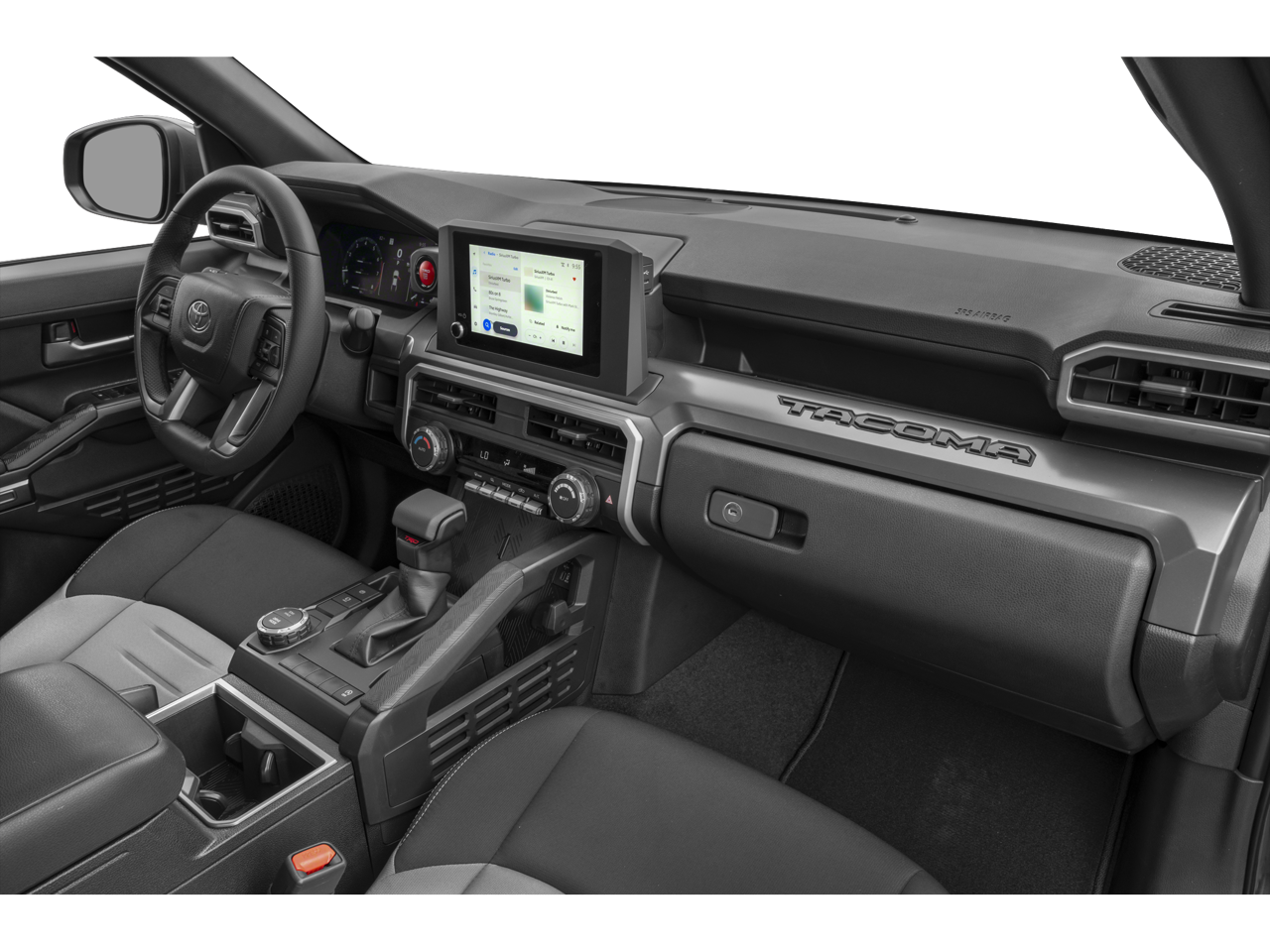 This 2025 Toyota Tacoma 4WD comes nicely equipped with 3.583 Axle Ratio, 4-Wheel Disc Brakes, 6 Speakers, ABS brakes, Air Conditioning, Alloy wheels, AM/FM radio: SiriusXM, Anti-whiplash front head restraints, Apple CarPlay/Android Auto, Auto High-beam Headlights, Auto-dimming Rear-View mirror, Automatic temperature control, Bed Step (TMS), Body Side Molding (TMS), Brake assist, Bumpers: body-color, Driver door bin, Driver vanity mirror, Dual front impact airbags, Dual front side impact airbags, Electronic Stability Control, Emergency communication system: Safety Connect (1-year trial), Exterior Parking Camera Rear, Fabric Seat Trim, Four wheel independent suspension, Front anti-roll bar, Front Bucket Seats, Front Center Armrest, Front fog lights, Front reading lights, Fully automatic headlights, Heated door mirrors, Illuminated entry, Knee airbag, Leather Shift Knob, Leather steering wheel, Low tire pressure warning, Occupant sensing airbag, Outside temperature display, Overhead airbag, Overhead console, Panic alarm, Passenger door bin, Passenger vanity mirror, Power door mirrors, Power steering, Power windows, Predator Step (TMS), Radio: 8 Toyota Audio Multimedia, Rear step bumper, Rear window defroster, Remote keyless entry, Security system, Speed control, Speed-sensing steering, Split folding rear seat, Spray-On Bed Liner (TMS), Steering wheel mounted audio controls, Tachometer, Telescoping steering wheel, Tilt steering wheel, Traction control, Trip computer, Turn signal indicator mirrors, Variably intermittent wipers, and Wheels: 18 TRD Sport Alloy.